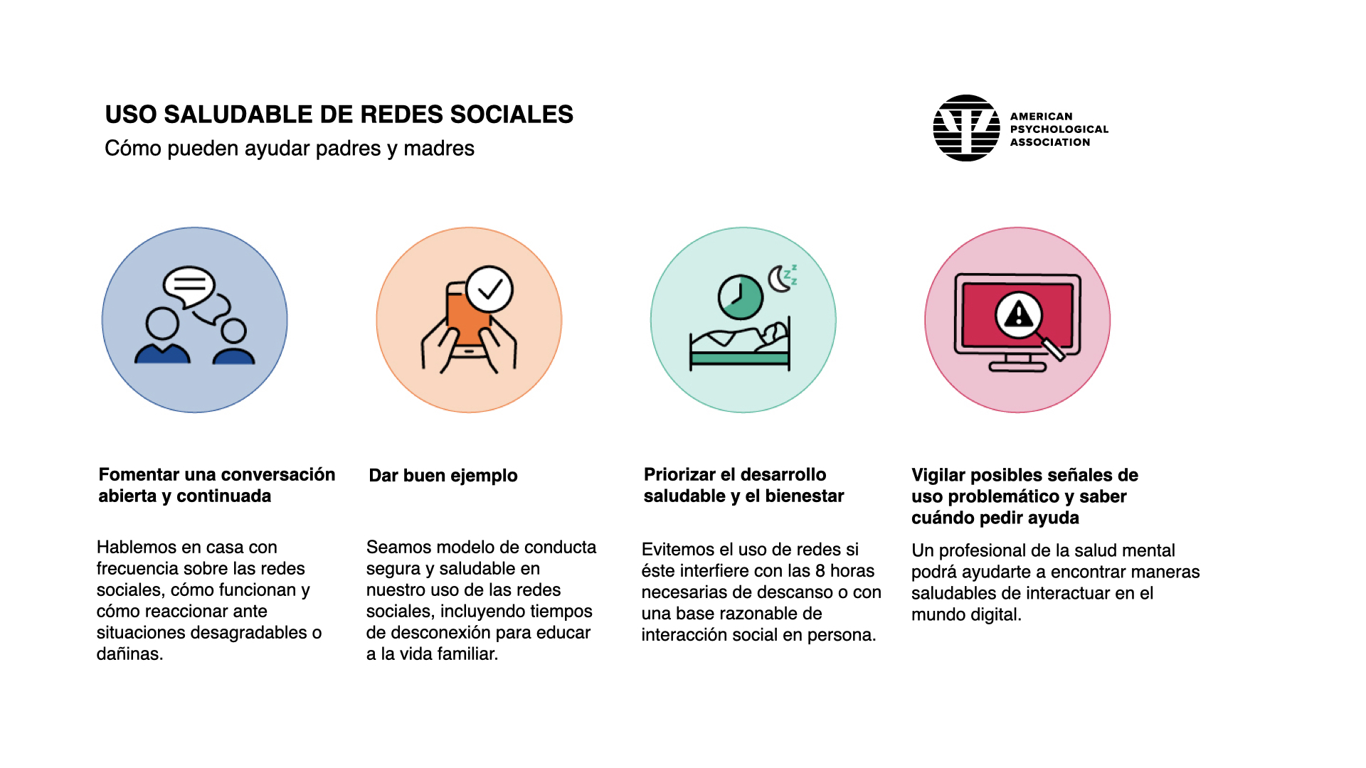 - Las siguientes recomendaciones reproducen políticas y resoluciones aprobadas por el Consejo de Representantes de la APA, incluida la Resolución de la APA sobre salud mental y conductual de niños y adolescentes y la Resolución de la APA sobre el desmantelamiento del racismo sistémico en contextos que incluyen las redes sociales. No son pautas de práctica profesional, sino guías que pretenden proporcionar información basada en la ciencia psicológica.